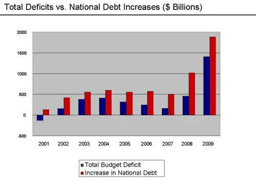 His administration increased federal government spending from $1.789 trillion to $2.983 trillion (66%), while revenues increased from $2.025 trillion to $2.524 trillion (from 2000 to 2008). Individual income tax revenues increased by 14%, corporate tax revenues by 50%, and customs and duties by 40%. Discretionary defense spending was increased by 107%, discretionary domestic spending by 62%, Medicare spending by 131%, social security by 51%, and income security spending by 130%. Cyclically adjusted, revenues rose by 35% and spending by 65%.[98] The increase in spending was more than under any predecessor since Lyndon B. Johnson.[99] The number of economic regulation governmental workers increased by 91,196.[100]