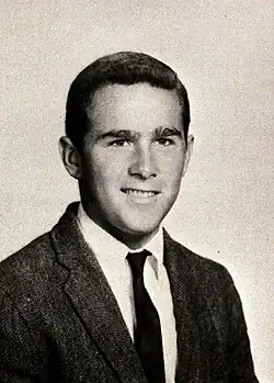 Bush later attended Phillips Academy, a boarding school in Andover, Massachusetts, where he played baseball and was the head cheerleader during his senior year.[6][7] He attended Yale University from 1964 to 1968, graduating with a Bachelor of Arts degree in history.[8] During this time, he was a cheerleader and a member of the Delta Kappa Epsilon, serving as the president of the fraternity during his senior year.[9][10][11] Bush became a member of the Skull and Bones society as a senior.[12] Bush was a rugby union player and was on Yale's 1st XV.[13] He characterized himself as an average student.[14] His grade point average during his first three years at Yale was 77, and he had a similar average under a nonnumerical rating system in his final year.[15]
