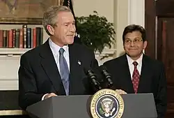 In his 2004 bid for re-election, Bush commanded broad support in the Republican Party and did not encounter a primary challenge. He appointed Ken Mehlman as campaign manager, and Karl Rove devised a political strategy.[84] Bush and the Republican platform emphasized a strong commitment to the wars in Iraq and Afghanistan,[85] support for the USA PATRIOT Act,[86] a renewed shift in policy for constitutional amendments banning abortion and same-sex marriage,[85][87] reforming Social Security to create private investment accounts,[85] creation of an ownership society,[85] and opposing mandatory carbon emissions controls.[88] Bush also called for the implementation of a guest worker program for immigrants,[85] which was criticized by conservatives.[89]