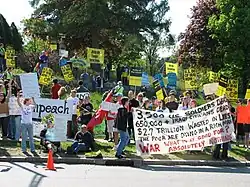 Bush had originally outlined an ambitious domestic agenda, but his priorities were significantly altered following the September 11 attacks.[93] Wars were begun in Afghanistan and Iraq, and there were significant domestic debates regarding immigration, healthcare, Social Security, economic policy, and treatment of terrorist detainees. Over an eight-year period, Bush's once-high approval ratings[94] steadily declined, while his disapproval numbers increased significantly.[95] In 2007, the United States entered the longest post-World War II recession.[96]
