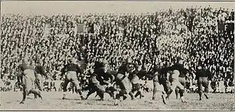 In the Kentucky game, Reese was sent in for Freddie Meiers to close out the game. He had one run of 35 yards, failing to score because of Kentucky's Brewer just getting his feet from behind.[16] The final week against Sewanee saw Vanderbilt win 26 to 0. The first scoring drive was marked by dashes around end from Reese and powerful runs off tackle by Freddie Meiers.[17][18] Reese went around the right end for 13 yards. Meiers then ran all the way down to Sewanee's 14-yard line, and Reese skirted around left end for ten more. After Meiers failed to gain on the next play,[19] Reese carried the ball for a score on a flank attack.[18] Towards the end of the game, Reese took two runs which together accounted for 19 yards.[18][19] He then ran up behind center to power his way into the end zone.[n 2] At year's end, Reese appeared on Billy Evans's Southern Honor Roll and the second team of All-Southerns chosen by Homer George, sports editor for The Atlanta Constitution.[20]