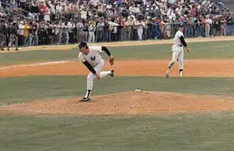 In the late 1970s and early 1980s, Gossage was one of the earliest manifestations of the modern closer, with a bold mustache and a gruff demeanor to go along with his overpowering 100 mph fastball.[1] He led the American League (AL) in saves three times and was runner-up twice; by the end of the 1987 season he ranked second in major-league career saves, trailing only Rollie Fingers, although by the end of his career his total of 310 had slipped to fourth all time. When he retired he also ranked third in major-league career games pitched (1,002), and he remains third in wins in relief (115) and innings pitched in relief (1,5562⁄3); his 1,502 strikeouts place him behind only Hoyt Wilhelm among pitchers who pitched primarily in relief. He also is the career leader in blown saves (112).[2] From 1977 through 1983 he never recorded an earned run average over 2.62, including a mark of 0.77 in 1981, and in 1980 he finished third in AL voting for both the MVP Award and Cy Young Award as the Yankees won a division title.[3]