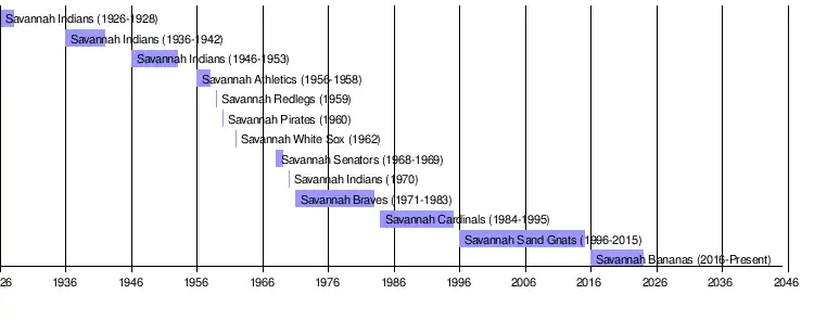 | Savannah Indians (SEL) 1926–1928 Savannah Indians (SL) 1936–1942 Savannah Indians (SL) 1946–1953 Savannah Athletics (SL) 1954–1955 Savannah Redlegs (SL) 1956–1958 Savannah Reds (SL) 1959 Savannah Pirates (SL) 1960 Savannah White Sox (SL) 1962 Savannah Senators (SL) 1968–1969 Savannah Indians (SL) 1970 Savannah Braves (SL) 1971–1983 Savannah Cardinals/Sand Gnats (SAL) 1984–2015 Savannah Bananas (BBCL) 2016–present | |