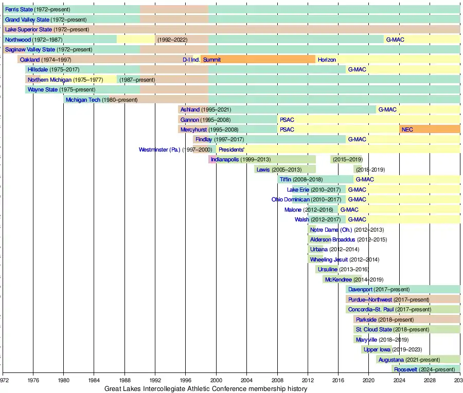 - ^ "GLIAC Membership History". Great Lakes Intercollegiate Athletic Conference. Archived from the original on November 30, 2011. Retrieved October 29, 2011.