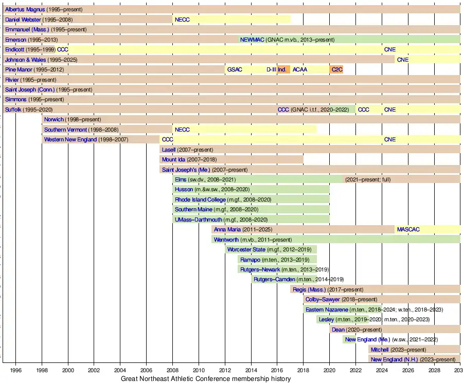 - 2025 – Two institutions left the GNAC to join their respective new home primary conferences, both effective after the 2024–25 academic year: