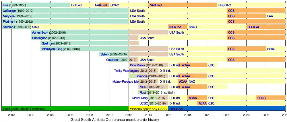 On May 6, 2015, the USA South Athletic Conference announced that Agnes Scott College, Salem College, and Wesleyan College would be leaving the GSAC and joining the USA South beginning in the 2016-2017 season.[9]