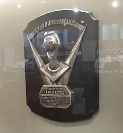 Maddux made his debut with the Braves on April 5, 1993, as their opening day starter against the Cubs at Wrigley Field, beating his former teammates 1–0.[19] He finished the regular season with a 20–10 record, led the NL with a 2.36 ERA, and won his second straight Cy Young Award.[20][21] The Braves took their rotation of Maddux, 22-game winner Tom Glavine, 18-game winner Steve Avery, and 15-game winner John Smoltz to the postseason. Maddux won against the Philadelphia Phillies in Game Two of the NLCS, but with Atlanta trailing 3 games to 2, lost the decisive Game Six.