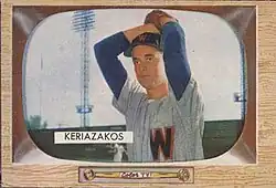 Keriazakos spent the entire 1954 campaign with Washington, appearing in 22 games, 19 in relief, and posting a creditable earned run average of 3.77. He started three times, and pitched complete games in two of them.