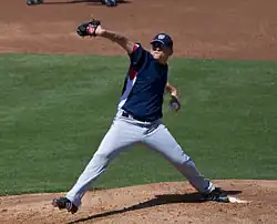 At spring training in 2005, Chacín landed a spot in the Jays' starting rotation. He jumped out to a hot start, earning a record of 4–1 with 18 strikeouts and a 2.41 ERA over 32.2 innings through the month of April, and was selected the American League Rookie of the Month.[1] In July, Chacín won five of his six starts, being named Rookie of the Month for the second time in the season.[2] Chacín pitched and won the final game of the season for the Blue Jays against the Kansas City Royals with a solid line of 7+2⁄3 innings, 7 hits allowed, 1 run, 1 walk, 3 strikeouts in the 7–2 Blue Jay win. Chacín finished the season with a record of 13–9 and 3.72 ERA in 34 starts. He collected 121 strikeouts in 203 innings. He finished fifth in Rookie of the Year voting, netting two first place votes and fourteen total points,[3] and was named to the Topps All-Star Rookie Team along with fellow Blue Jay Russ Adams.[4]