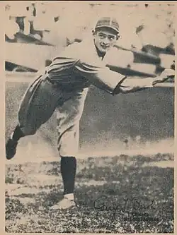Bush followed up with a career year in 1929. He finished the year on top of the league in saves and games pitched, and fourth in the league for wins.[4] Also that year, Bush ranked twelfth in the NL Most Valuable Player Award voting.[4] Even more impressive, Bush had a streak of eleven straight wins until it was broken by a relief loss on August 12 against the Braves.[1] Bush was a large contributor to the team's pennant-winning season, in which they finished on top of the NL with a 98–54 record.[6] Bush was most dominant in the 1929 World Series against the Philadelphia Athletics. Bush pitched two games in the series, starting one and relieving another. Bush started Game 3 and pitched a complete game, surrendering only one run on nine hits.[7] Despite the Cubs' loss of the Series in five games, Bush pitched a total of eleven innings with 4 strikeouts and gave up just one run.[7] After the success of the 1929 season, Bush had a disappointing season in 1930. In 225 innings of work, Bush posted a 15–10 record with a 6.20 ERA, one of the worst in the league that season. He gave up 291 hits, fifth highest in the league, and led the league in earned runs allowed with 155 and wild pitches with 12. In November 1930, writer F.C. Lane wrote in Baseball Magazine about Bush's unique pitching windup: