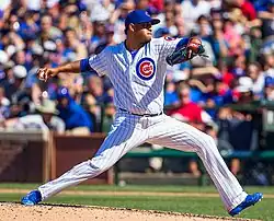 After struggles by Cubs closer José Veras early in the 2014 season, Rondón was named the new Cubs closer. He had a breakout 2014 season. He earned two saves in the 2015 National League Division Series against the St. Louis Cardinals, including a save in the series-clinching game 4.[3] With the addition of Aroldis Chapman in late July 2016, Rondon was moved to the setup role in the bullpen. Rondon finished 2016 with a 2–3 record and a 3.53 ERA in 54 appearances. The Cubs won the 2016 World Series over the Cleveland Indians, ending the Cubs' 108-year drought.[4] He was non-tendered and became a free agent on December 1, 2017.