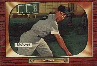 Brown was born in Greensboro, North Carolina, and was nicknamed "Skinny" by his parents because he was a chubby child.[4] Brown weighed 180 pounds (82 kg) and stood 6 feet 2 inches (1.88 m) tall during his active career. He was 26 years old when the White Sox purchased his contract from the Triple-A Seattle Rainiers and he made his major league debut with the team on April 19, 1951. He spent two years with the White Sox before moving to the Red Sox, the team that had originally signed him to a pro contract in 1946. In 1953, Brown went 11–6 in 25 starts. He joined the Orioles in July 1955, winning 34 games for them from 1956 to 1959. In 1960, he compiled a 12–5 mark with a career-low 3.06 ERA for a contending Baltimore team that finished second in the American League. The next year, he went 10–6 with a 3.19 ERA. He was sold to the pennant-bound Yankees in September 1962.