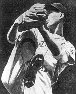 The 1943 season saw a couple of changes in the Tigers lineup. Firstly, former catcher Steve O'Neill became the new manager of Detroit. Replacing him at the catcher spot would be Paul Richards,[13] who last played for the Philadelphia Athletics in 1935.[17] Richards was largely tasked with bringing Newhouser and his young compatriots to their full potential.[13] At the start of the season, he had proven successful in doing this, as Newhouser credited Richards for his hot start. His 14 strikeouts on May 27 against the New York Yankees were the most a pitcher had put up in a single game since Bob Feller threw 18 in 1938. Through the beginning of June with 50 innings pitched, his earned run average was 0.90, 0.19 lower than Dutch Leonard's full season record.[18] Once again, Newhouser was selected for an All-Star Game, recording a strikeout in three innings of work in the Midsummer Classic.[19] Despite the initial success, Newhouser lost nine straight games from late July to September[20] and finished the season with a dismal 8–17 record[13] and a league-leading 111 walks.[21] Following a September in which he posted a 5.19 ERA, he likely would have been let go had the wartime league talent not been so thin.[13]