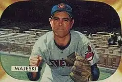 A year later, his contract was purchased by the Cleveland Indians, where he served as a utility infielder behind Al Rosen and helped tutor a young Bobby Ávila.[24] Majeski helped the Indians win the 1954 American League Pennant, batting .281 with only 3 errors while backing up Rosen at third base and filling in as a second baseman when Avila was injured.[25] He also hit a pinch-hit three-run home run in Game 4 of the 1954 World Series in a losing cause against the New York Giants.[26] He was traded to the Baltimore Orioles in June 1955 and then retired as a player at the end of the season at 38.[22]