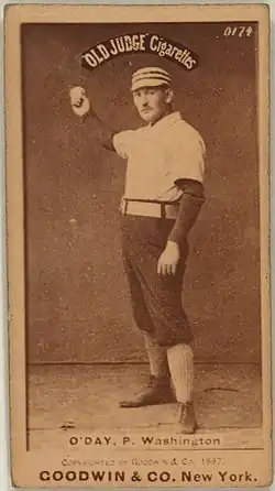 O'Day spent most of 1886 with the Savannah team in the Southern Association, and during his time there he was considered a favorite among other players.[29] In 39 games with Savannah, O'Day won 26 games, lost 11, and had an ERA of 1.03.[26] Late in the year, he joined the Washington Nationals, where he posted a 2–2 record in six games. O'Day became a full-time starter for the Nationals in 1887 and pitched the second-most games behind Jim Whitney. In 30 games, he won 8 games, lost 20, and had a 4.17 ERA and 109 walks, the fifth-most walks in the league. In 1888, O'Day became the Nationals' workhorse, starting 46 games. His ERA and win totals improved to 3.10 and 16, but he led the NL in losses with 29 and was second in walks with 117 in 403 innings pitched. He also played eight games at shortstop in 1887 and 1888.[23] O'Day's high loss total was noted by Sporting Life as due to ineffective hitting by the Nationals rather than as a result of his pitching.[30]