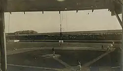 A new stadium was built on the site, opening in 1910 and described at the time as the largest in all of the minor leagues with over 17,000 seats.[3] It was designed by Toronto-based architect Charles F. Wagner. Initial advertising referred to the site as Hanlan's Point Stadium. It was also sometimes called Island Stadium. The first baseball game at the stadium—but not the first event in the building—took place on May 9, 1910 with the Leafs rallying to defeat the Baltimore Orioles in the bottom of the ninth inning in front of a paid crowd of 12,867.