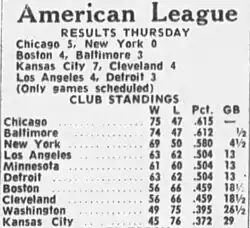 The following weekend, the Yankees swept the Red Sox at home, while the White Sox and the Orioles split a series of their own. "That's when we knew we had a chance", Clete Boyer later recalled. At the end of August, the Orioles' lead was only three games.[33]