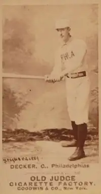 Earle Harry Decker (September 3, 1864 - ?) was an American Major League Baseball catcher. Walker was born in Lockport, Illinois. He played four seasons in Major League Baseball, with the Indianapolis Hoosiers, Kansas City Cowboys, Detroit Wolverines, Washington Nationals, Philadelphia Phillies and Pittsburgh Pirates. Decker's primary position was catcher, but he also played outfield, first base, second base, third base and shortstop. SABR (Society for American Baseball Research) says Decker is credited by many as the inventor of the catcher's mitt. He also served time in San Quentin Penitentiary, California, and a picture of him on the jail baseball team survives.[1] It is unknown where he went from there, receding into the mists of history. As is the case with approximately 200 other 19th-century ballplayers, the date of his death is unknown.