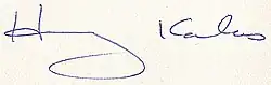 Kalas was interred at Laurel Hill Cemetery in Philadelphia.[28] In August 2009, two pairs of seats from Veterans Stadium were installed at his graveside, one pair on each side, facing each other at a 45° angle. In the summer of 2010, a headstone was added to the grave, and the fan-made plywood "P" was removed as was the bronze plaque with his likeness. The headstone consists of a granite microphone with the letters "HK" in the middle and a likeness of Kalas' autograph, which includes the "HOF 2002" that Kalas added to his autographs after his receipt of the Ford C. Frick Award, at the microphone's base, and that sits on top of a raised base shaped like a home plate. Engraved in the base are the following words: