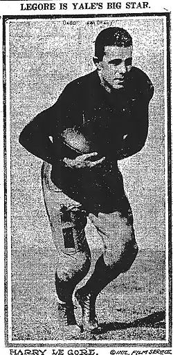 In 1914, LeGore was the starting fullback for a Yale football team that compiled a 7-2 record and defeated Notre Dame 28-0, ending Notre Dame's 27-game win streak. Knute Rockne later wrote in his autobiography: "I sat on the sideline at New Haven that Saturday and saw a good Yale team captained by Bud Talbott with a crack halfback named Harry LeGore leading the attack. They made Notre Dame look like a high school squad."[2]