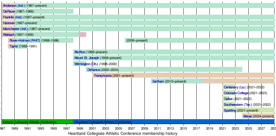 The addition of three Ohio schools (Bluffton College, the College of Mount St. Joseph, and Wilmington College) and the departure of two Indiana schools (DePauw and Rose-Hulman) during the 1998–99 season prompted a change in name to Heartland Collegiate Athletic Conference. Wabash and Wilmington later departed in the 1998–99 and 1999–2000 seasons respectively. Defiance College and Transylvania University joined in 2000 and 2001 respectively. Rose-Hulman re-joined the HCAC, effective for the 2006–07 season.