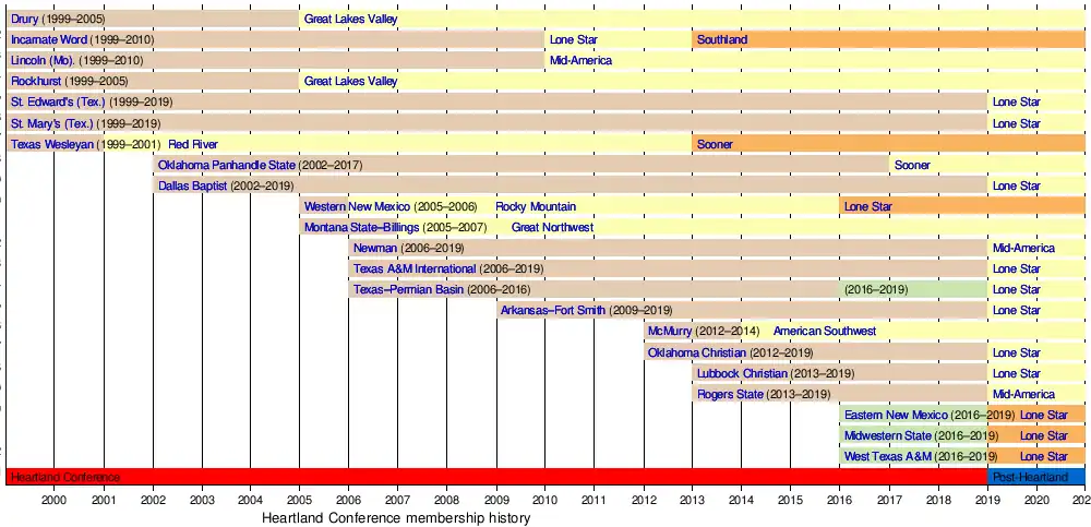 The conference was formed in 1999 by founding members Drury University, University of the Incarnate Word, Lincoln University, Rockhurst University, St. Edward's University, St. Mary's University and Texas Wesleyan University. Oklahoma Panhandle State University and Dallas Baptist University joined in 2002. Founding members Drury and Rockhurst left the Heartland Conference to join the Great Lakes Valley Conference (GLVC) in 2005. Western New Mexico University and Montana State University - Billings joined in 2005. However, WNMU re-joined the Rocky Mountain Athletic Conference in 2006 and MSUB joined the Great Northwest Athletic Conference in 2007. Newman University, Texas A&M International University and the University of Texas of the Permian Basin joined the conference in 2006, making the transition from NAIA to NCAA Division II.[1] The University of Arkansas – Fort Smith joined the conference in the Fall of 2009 after transitioning from the NJCAA.[2] In the fall of 2010, Lincoln left for the Mid-America Intercollegiate Athletics Association[3] and Incarnate Word left for the Lone Star Conference.[4] In July 2011, McMurry University announced that it had been accepted as candidate for D-II membership and would join the Heartland Conference in the fall of 2012.[5] In February 2012, Oklahoma Christian University announced its intention to seek membership in NCAA Division II.[6] In Spring 2012, Rogers State University, a member of the NAIA Sooner Athletic Conference, applied for membership.[7] The conference confirmed in July 2012 that Oklahoma Christian's teams would play full conference schedules starting in Fall 2012 and that Rogers State and Lubbock Christian University would begin conference play in 2013-14.[8]