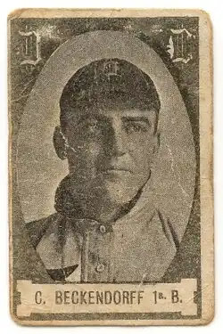 In November 1909, Beckendorf was among a group of players from the 1909 Tigers that toured Cuba and played 12 exhibition games against two integrated Cuban teams, Habana and Almendares. He alternated as a catcher and right fielder during the Cuban tour.[3] The Cabañas Company printed a series of baseball cards showing the members of the Almendares, Habana and Detroit baseball teams. Beckendorf's Cabañas card is displayed to the right.