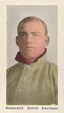 At the end of July 1908, Beckendorf was purchased from Scranton by the Detroit Tigers with the condition that he would report to Detroit in the spring.[9] In November 1908, Sporting Life reported on Connie Mack's offer to purchase Beckendorf from Detroit: "Beckendorf, the other new catcher, so strongly impressed Connie Mack that he offered the Tigers $2,500 in cash and might have gone higher had there been any use. Mr. Mack told a local man that never in his experience had he seen a catcher get more out of his pitchers than this man Beckendorf did in a long examination he underwent, with the eye of that master looking on."[10]