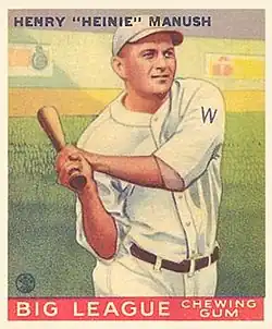Henry Emmett Manush (July 20, 1901 – May 12, 1971), nicknamed "Heinie", was an American baseball outfielder. He played professional baseball for 20 years from 1920 to 1939, including 17 years in Major League Baseball for the Detroit Tigers (1923–1927), St. Louis Browns (1928–1930), Washington Senators (1930–1935), Boston Red Sox (1936), Brooklyn Dodgers (1937–1938), and Pittsburgh Pirates (1938–1939). After retiring as a player, Manush was a minor league manager from 1940 to 1945, a scout for the Boston Braves in the late 1940s and a coach for the Senators from 1953 to 1954. He also scouted for the expansion Senators in the early 1960s. He was inducted into the Baseball Hall of Fame in 1964.