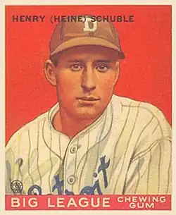 Henry George "Heinie" Schuble (November 1, 1906 – October 2, 1990) was an American baseball infielder. He played professional baseball for 11 years from 1926 to 1936, including seven seasons in Major League Baseball with the St. Louis Cardinals (1927 and 1936) and Detroit Tigers (1929–1935). He appeared in 332 major league games (172 at shortstop, 106 at third base) and compiled a .251 batting average and .296 on-base percentage.