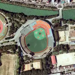 The stadium's playing field was traditionally Japanese, curved and symmetrical;[25] the distances from home plate to the outfield wall were 92 metres (302 ft) to the foul poles, 110 metres (360 ft) to left- and right-center fields, and 122 metres (400 ft) to the center field wall.[26] Its surface was natural turf until 1979, when it was converted to artificial turf until the stadium's demolition.[2]