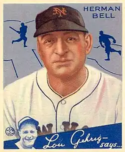 Herman S. "Hi" Bell (July 16, 1897 – June 7, 1949) was an American professional baseball pitcher. He played in Major League Baseball (MLB) for the St. Louis Cardinals and New York Giants. For his career, he compiled a 32–34 record in 221 appearances, most as a relief pitcher, with a 3.69 earned run average and 191 strikeouts.[1] Bell was a member of three National League pennant winners (1926, 1930, and 1933), winning two World Series with the 1926 Cardinals and the 1933 Giants. In World Series play, he recorded no decisions in three appearances, with a 4.50 earned run average and 1 strikeout. On July 19, 1924, Bell became the last pitcher in Major League history to start and win both ends of a doubleheader.[2][3]