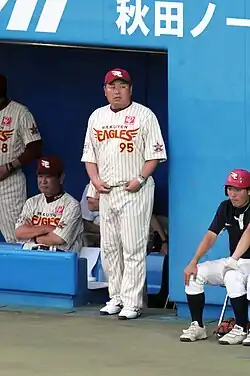 Hiromoto Okubo (大久保 博元, born February 1, 1967), nickname "Dave" is a former Nippon Professional Baseball catcher. After playing, he turned to managing and coaching. In 2015, Hiromoto was promoted from Rakuten's farm team manager to Tohoku Rakuten Golden Eagles full-time manager. He only lasted one season, however, as he resigned after the team again finished in last place.[1] In Kobe Earthquake Dream Match 1995, he played for the Foreign Dream with registered name "Dave" because without foreign player catcher.