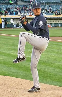 Iwakuma signed with the Seattle Mariners prior to the 2012 MLB season, for $1.5 million guaranteed, plus an additional $3.4 million in incentives linked to starts, innings pitched, and awards.[18] He was part of the Mariners' bullpen to start the season and did not pitch until the club's fifteenth game, making him the last member of any team's opening day roster (who was not injured or demoted to the minor leagues) to appear in a game.[19] Iwakuma later became an effective member of the Mariners' pitching staff, pitching in 30 games (16 starts and 14 relief appearances), going 9–5 with two saves and a 3.16 earned run average.