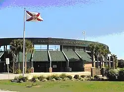 Historic Sanford Memorial Stadium is a baseball stadium located in Sanford, Florida. The ballpark is located just south of Lake Monroe on Mellonville Avenue, less than a mile from Historic Downtown Sanford. The stadium stands at the site of the old Sanford Field, which was originally built in 1926.[1] The stadium was built on the old site in 1951 as the Spring Training Facility of the New York Giants.[2] Many Major League stars have played in the stadium including Babe Ruth, Jackie Robinson, Willie Mays, Tim Raines, and David Eckstein. The Stadium was refurbished in 2001 at a cost of two million dollars, and now offers many modern amenities along with the classic architecture typical of stadiums built in the early to mid 1900s.[2]