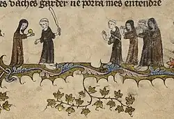 A game from the Cantigas de Santa Maria, c. 1267, involving tossing a ball, hitting it with a stick and competing with others to catch it