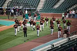 After 2002, the Giants went through many personnel changes. Baker's managerial contract was not renewed after ten seasons, and he left to manage the Chicago Cubs. In addition, Gene Clines, Sonny Jackson, and Juan López all left the Giants and joined Baker in Chicago.[20] Nen's damaged shoulder ended his career, forcing him into early retirement; and Kent, moving onto the Houston Astros, was not re-signed. He had aroused Giants front office ire earlier in the season with an off-field injury during spring training in which he broke his wrist after claiming that he had slipped and fallen off the roof of his vehicle while washing it. It later was discovered that he had lied and that, in reality, he had accidentally crashed his motorcycle while performing wheelies and other stunts, violating his contract.[21] He had also gotten into a fight with Bonds in the dugout during a game against the San Diego Padres, which was caught on tape, and in which other teammates intervened to separate the two.[22] Position players David Bell, Reggie Sanders, Tsuyoshi Shinjo, and Kenny Lofton, as well as pitchers Liván Hernández, Russ Ortiz, and Aaron Fultz, all went to other teams in 2003 as well.