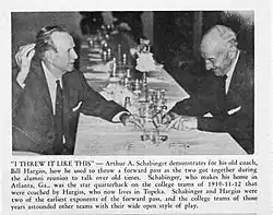 In the team's 1910 game at Washburn, Arthur Schabinger has been credited by some to have thrown the first legal forward pass in college football history.[7] While this claim is widely disputed by other colleges (there are multiple claims dating back to 1906), College of Emporia most certainly was one of the first innovators of the play particularly to throw "overhand" forward passes instead of the more common "underhand" passes.[8] The school was using the forward pass as a regular play three years before Knute Rockne and Notre Dame.[9]