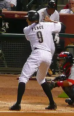 In his third season (2009), Pence was named an All-Star for the first time.[17] In his fourth season (2010), he batted .282 with 25 home runs, drove in 91 RBIS and played 156 games. For the week of August 30 – September 5, 2010, Pence was named National League Player of the Week for the second time in his career after batting .500 (11-for-22) and slugging .909 with two home runs.[18]