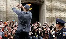 His performance helped lead the Giants to their third World Series title in five years, as San Francisco went on to beat the Royals 3–2 in Game 7. Pence finished the series batting .444 with 5 RBIs and 7 runs scored. He had 12 hits in the series and, along with teammate Brandon Belt, had at least one hit in every game of the 7-game series.[43] Pence's performance drew some media comparisons to Barry Bonds, in terms of unusual statistical production.[44]