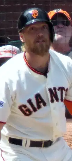 Hunter Andrew Pence (born April 13, 1983),[1][2] nicknamed "the Reverend,"[3] is an American former professional baseball right fielder and designated hitter. He played in Major League Baseball (MLB) for the Houston Astros, Philadelphia Phillies, San Francisco Giants, and Texas Rangers. In the 2004 Major League Baseball Draft he was drafted in the second round by the Astros. Pence made his major league debut in 2007. He is a four time All-Star and was a member of the 2012 and 2014 World Series championship teams with the Giants.