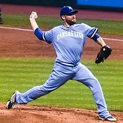 On January 16, 2016, the Kansas City Royals signed Kennedy to a five-year, $70 million contract, with an opt-out clause built in prior to the 2018 season.[77] Kennedy was happy to join the team, which he described as "an easy environment", and particularly enjoyed the reunion with his Yankees pitching coach, Dave Eiland.[78] On the final day of spring training, Kennedy exited the mound shortly before the fourth inning with left hamstring tightness. Manager Ned Yost said that the removal was precautionary for a "slight" injury.[79] Kennedy later took the win in his Royals debut, striking out seven batters in 7+2⁄3 innings in a 7–0 shutout of the Minnesota Twins.[80] The Royals could not keep apace of their previous World Series-winning season, however, and on July 25, Kennedy managed to load the bases within six minutes of the first pitch of the game, putting the Royals in a 4–0 deficit out of the gate.[81] He followed this effort by allowing only three runs in four starts, but was not credited with a win between June 26 and August 15. The drought was ultimately broken when Kansas City defeated Detroit 3–1.[82] While Kennedy was mostly happy with his performance during the 2016 season, in which he went 11–11 with a 3.68 ERA and struck out 184 batters in 195+2⁄3 innings, he was disappointed that the Royals did not reach the postseason, and his 33 home runs allowed were "a lot more" than he had been "expecting or hoping for".[83]