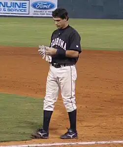 University of Missouri Tigers coach Tim Jamieson spotted him in a summer league, and convinced him to head east for his junior year. Jamieson said, "I saw him take ground balls and thought, defensively, he was as good a middle infielder as I had ever seen. As for his bat, I didn't really care."[24] While there, Kinsler had a .335 batting average, .416 on-base percentage, and .536 slugging percentage, with 16 steals in 17 attempts.[25][26] He was named to the All-Big 12 Conference second team.[27] Jamieson noted, "From the day Ian stepped through the doors here, you could see it on his face: He was on a mission."[15]