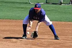 Kinsler was then drafted a third time by the Texas Rangers in the 17th round (496th overall) in 2003 as a shortstop at the urging of area scout Mike Grouse.[28] Grouse liked Kinsler's tools, makeup, desire, and gritty approach.[25] In Grouse's scouting report, he wrote that Kinsler had a great feel for the game, athleticism, solid defensive skills, intensity, and leadership qualities. Grouse knew that Kinsler was probably being underrated by rival scouts who did not know that Kinsler had played with a foot stress fracture while at Missouri, "so [Kinsler] really couldn't run like I knew he could. I'd seen him in Wichita the year before, so I knew he was a plus runner. Most people ... didn't know that, so they probably downgraded him. But I knew it, and I wasn't telling anybody."[28] Kinsler, for his part, says: "I thought I was a lot better than a 17th round pick. I thought I belonged in the top 10 rounds."[28] Kinsler nonetheless agreed to sign with the Rangers on his 21st birthday, for $30,000.[29]