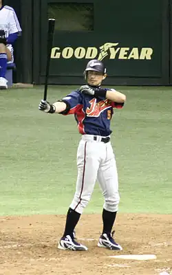 Suzuki made his NPB Pacific League debut in 1992 for the Orix BlueWave at the age of 18, but he spent most of his first two seasons in the farm system (accumulating 156 minor league hits and a .368 batting average)[15] because his then-manager, Shōzō Doi, refused to accept Suzuki's unorthodox swing. The swing was nicknamed 'pendulum' (振り子打法, Furiko Dahō) because of the pendulum-like motion of his leg, which shifts his weight forward as he swings the bat, and goes against conventional hitting theory. In his second career game, he recorded his first ichi-gun (Japan's Nippon Professional Baseball League) hit in the Pacific League against Fukuoka Daiei Hawks pitcher Keiji Kimura.[16] Despite hitting a home run in 1993 against Hideo Nomo, who later won the National League Rookie of the Year Award, Suzuki was nevertheless sent back to the farm system on that very day. In 1994, he benefited from the arrival of a new manager, Akira Ōgi, who played him every day in the second spot of the lineup. He was eventually moved to the leadoff spot, where his immediate productivity dissolved any misgivings about his unconventional swing. He set a Japanese single-season record with 210 hits, the first player ever to top 200 hits in a single season. Five other players have since done so: Matt Murton, Norichika Aoki (twice), Alex Ramírez, Tsuyoshi Nishioka, and Shogo Akiyama.