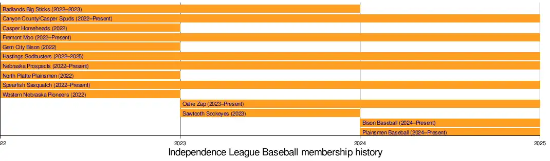 Independence League Baseball is a collegiate summer baseball league in the United States with teams playing in Nebraska, South Dakota, and Wyoming.[1] The league played its inaugural season in 2022 with ten teams[2] and had eight teams for 2023.[3] As of January 2024, eight teams are listed for the 2024 season.[4]