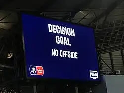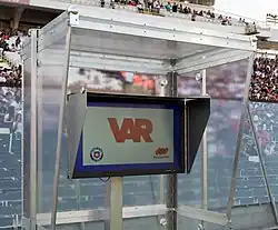 In September 2016, the video review system known as Video Assistant Referees (VAR), was first used in an international friendly between Italy and France. The system was implemented at a FIFA World Cup for the first time at the 2018 FIFA World Cup.[39][21]