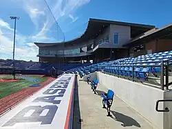 The scoreboard is a Daktronics scoreboard featuring both a video screen and a fixed digit scoreboard. There is an additional auxiliary scoreboard in the stands so the fans in the outfield can see the game updates.[8]
