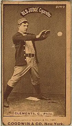 Clements spent the next 13 seasons with the Quakers (who became the Phillies in 1890), and became the team's regular catcher in 1888.[4] He also served as a player-manager during part of the 1890 season when manager Harry Wright suffered temporary blindness.[6][7] During the 1890s, he established himself as one of the National League's top hitters, finishing among the top 4 in batting average on 3 occasions.[4] Clements also hit for power, finishing second in the NL with 17 home runs in 1893 and finishing third in the NL with 13 in 1895.[4] Also in 1895, he finished with a .394 batting average, the highest single-season average by a catcher in major league history.[8]