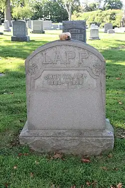 After battling influenza for several weeks, Lapp died on February 6, 1920, of pneumonia and is interred at Mount Peace Cemetery in Philadelphia, Pennsylvania.[3]